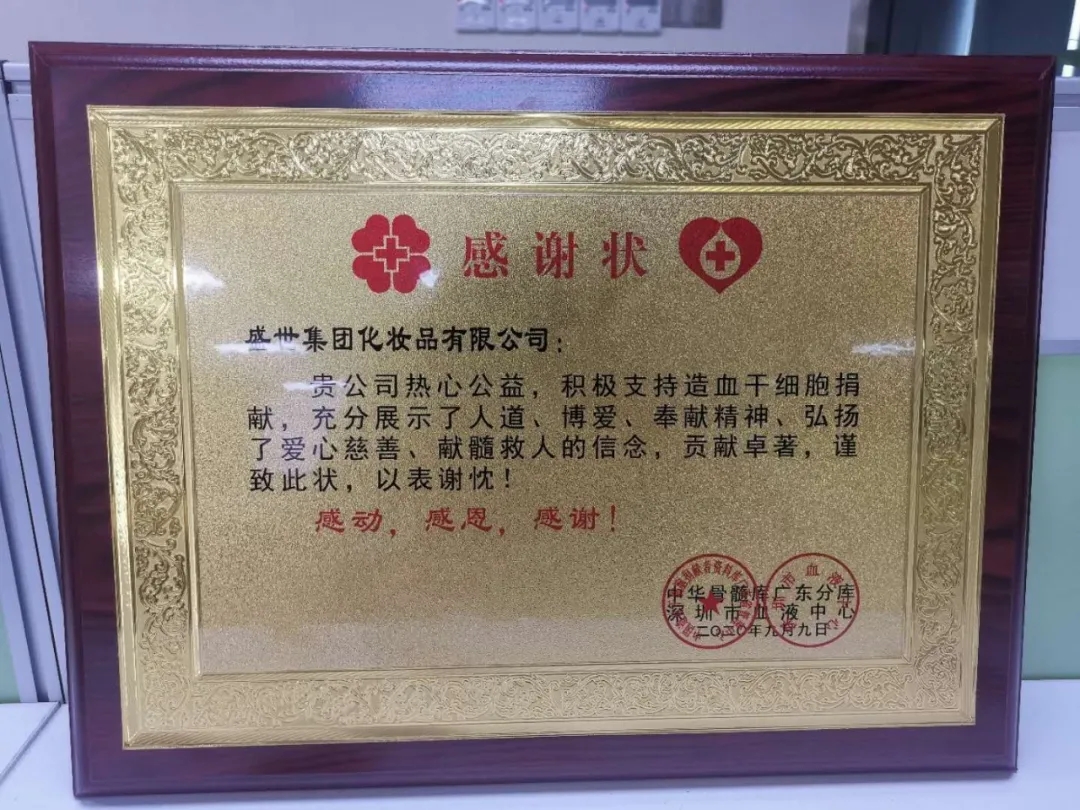 ▲中華骨髓庫廣東分庫給予盛世集團的感謝狀。