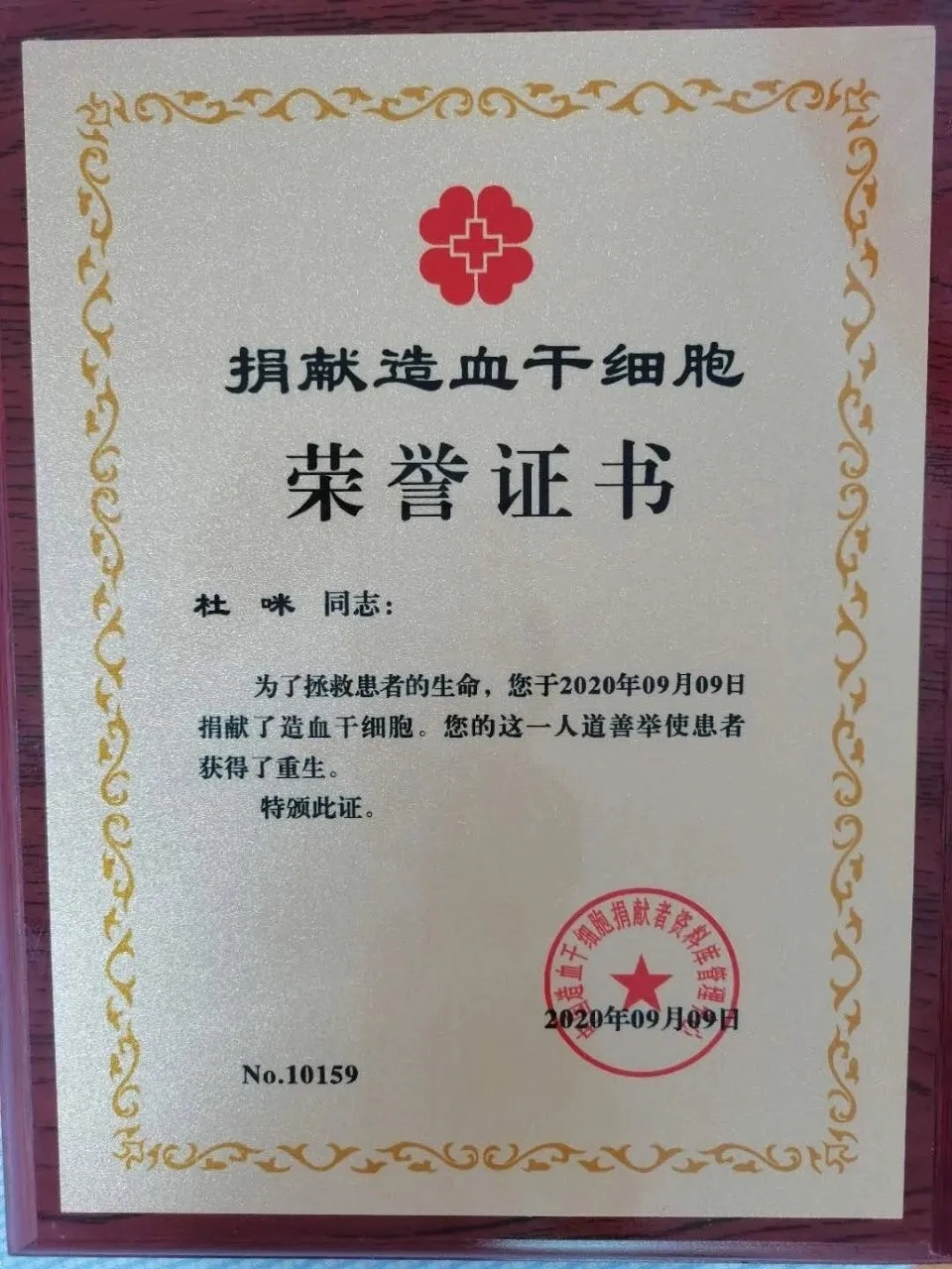 杜咪此次捐獻造血干細胞,更是中華骨髓庫自1992年成立后,第10159位非親緣造血干細胞捐獻者,這是一份榮譽,更是一份責任。杜咪堅定地表示,作為一名退伍軍人,作為一名盛世人,對此次的捐獻感到無比的激動與自豪!